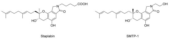 - Kohyama, T.; Hasumi, K.; Hamanaka, A.; Endo, A. SMTP-1 and -2, novel analogs of staplabin produced by Stachybotrys microspora IFO30018. J. Antibiot. 1997, 50, 172–174. [Google Scholar] [CrossRef]