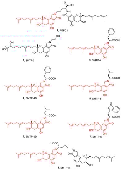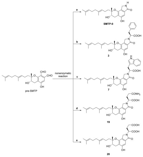 In 2012, Nishimura et al. isolated a new compound designated pre-SMTP from fungus S. microspora, which directly afforded SMTP congeners by reacting nonenzymatically (phthalaldehydes reaction) [,]. Pre-SMTP accumulated, with limited amounts of amine, in medium with S. microspora, and it consumed rapidly after increased amine feeding. Meanwhile, SMTP-0, as well as congeners 3, 7, 19, and 20 were afforded, by reaction of pre-SMTP, with ammonium chloride, L-phenylalanine, L-tryptophan, L-glutamine, and L-glutamic acid, respectively. Thus, it is available to synthesize a variety of congeners, with different N-linked side-chain structures, through nonenzymatic reaction between pre-SMTP and an amine (Figure 10).