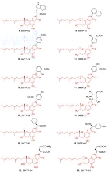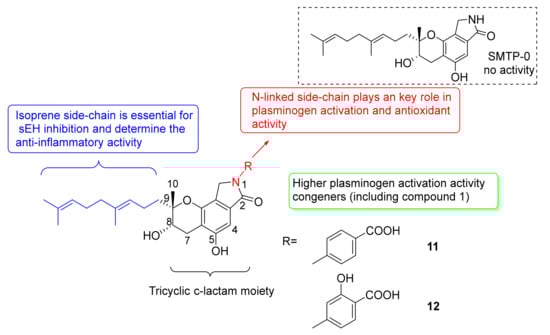 The structure–activity relationships of the plasminogen modulator compound 1 and its congeners have been studied in detail. Most congeners contain the same geranylmethyl side-chain, but they bear different N-linked side-chains. Congener 2 possessed a hydroxylated geranylmethyl side-chain [] and could not enhance plasminogen binding to the activated plasminogen. Thus, the side-chain of geranylmethyl plays a key role in promoting plasminogen activation. In 2016, Otake et al. found that the geranylmethyl side-chain of congeners was critical to inhibitory activity of soluble expoxide hydrolase (sEH), an enzyme mediating anti-inflammatory action []. sEH lost inhibitory activity with the increasing number of hydroxyl groups on geranylmethyl side-chains or missing geranylmethyl side-chains, and the terminal hydroxy group of side-chain led to the damage of cellular localization. For the N-linked side-chain, Hasumi et al. isolated the simplest congener (SMTP-0) without an N-linked side-chain, which had no plasminogen activation effect [] (Figure 5). It can be concluded that the N-linked side-chain was essential for plasminogen-modulating activity. In 2010, Hasegawa et al. confirmed the crucial role of the N-linked side chain in modulating plasminogen []. The congeners, without ionizable groups in N-linked side-chain, were inactive in plasminogen activation, such as with congener 10. Moreover, the congeners, with an aromatic group and a negatively ionizable group on the side-chain, were more active for the enhancement of plasminogen activation than those with an aliphatic group and a negatively ionizable group, such as congener 3 (Emax = 15-fold). Koide et al. further isolated a series of SMTP congeners with different N-linked side-chains and evaluated their bioactivities. Congeners 11 (Emax = 126-fold) and 12 (Emax = 159-fold) were as potent as compound 1 (Emax = 102-fold) in plasminogen-modulating activity []. Only these congeners could express higher plasminogen-modulating and anti-oxidative activities, and other isomers or phenolic hydroxy groups, at different positions, did not present satisfactory activities in plasminogen activation. Moreover, the congeners with N-linked side-chains showed anti-oxidative activities too. All the congeners bearing a phenolic hydroxy group and a carboxylic acid group displayed higher anti-oxidative activities. Congener 12, especially, possessed more than 1.7 times the anti-oxidative activity in comparison to compound 1 (Figure 5).