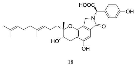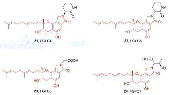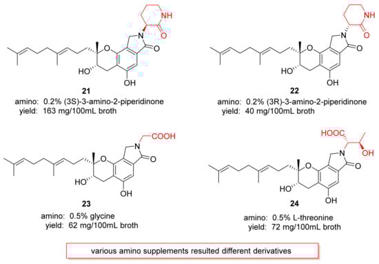 Yin et al., (2017) studied the biosynthesis pathway in S. longispora FG216 []. The results were that three reported core genes and the nitrate reductase (NR) gene copy were the isoindolinone biosynthetic gene cluster in S. longispora FG216. NR is the rate-limiting enzyme of nitrate reduction. Therefore, nitrate reductase possibly played a role in the balance of ammonium ion concentration. Moreover, four new derivatives, 21–24, were obtained by various amino supplements in S. longispora FG216 (Figure 12).