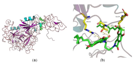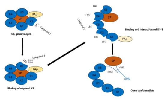 Wu group further studied the interaction mechanism between compound 1 and plasminogen []. The Glu-plasminogen, in the bloodstream, contains a Pan-apple domain (PAp), five kringle domains (KR1-KR5), and a serine protease domain (SP). Lysine-binding sites (LBS), in kringle domains of plasminogen, were essential for the interaction of plasminogen and compound 1 [,,]. Compound 1, firstly, bound the LBS of KR1, while KR1 activated and mediated the interaction between plasminogen and the C-terminal lysine moiety on fibrin. KR5 dropped from PAp and was exposed to closed plasminogen temporarily []. Then, compound 1 formed hydrogen bonds with Asp518 and Asp534 in KR5, which induced conformational change and structural rearrangement. After that, additional LBSs on kringle domains were exposed, leading the movement of PAp. Therefore, these additional LBSs interacted with compound 1, causing an open conformation of plasminogen, which could be easily activated by u-PA (Figure 3). The theoretical binding mode showed that compound 1 formed a stable complex with Glu39, Thr41, and Arg43 in plasminogen with hydrogen bonds (Figure 4).