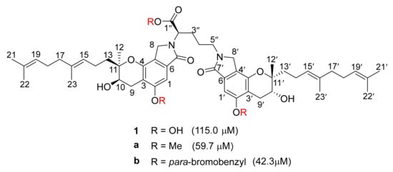 Mammalian sEH contributes to inflammatory response through hydrolyzing lipid signaling molecules, and it has been developed as a potential therapeutic target [,]. More than 100 sEH inhibitor patents have been published for the treatment of diabetes, hypertension, pain, and cardiovascular diseases [,]. The geranylmethyl side-chain of compound 1 is crucial to the inhibitory activity of sEH []. Therefore, compound 1 and other staplabin congeners possessed great anti-inflammatory potential.