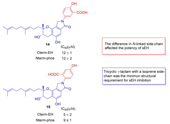 sEH is a bifunctional enzyme with a C-terminal domain (Cterm-EH) and an N-terminal domain (Nterm-phos). Cterm-EH catalyzes hydrolysis of epoxyeicosatrienoic acids (EETs, an endogenous signaling molecule involved anti-inflammation), and Nterm-phos hydrolyzes lipid phosphates [,,]. Therefore, the inhibition to Cterm-EH is the key to inhibit inflammation. Mastsumoto et al. performed sEH inhibition kinetic analysis of congeners []. Congeners 14 (IC50 = 12 ± 1) and 15 (IC50 = 5 ± 2) had better Cterm-EH inhibitory activities in comparison to congeners 10 (IC50 > 100) and 16 (IC50 > 100). Therefore, although the geranylmethyl side-chain was essential to the inhibitory activity, the nature of N-linked side chains also affected the inhibitory potency of sEH (Figure 7). Compound 1 inhibited the hydrolysis of EETs with IC50 of 6.5 μM. SMTP-0 (IC50 = 1.2 μM) and congener 18 (IC50 = 9.2 μM) were also efficient for inhibiting the hydrolysis of EETs []. Meanwhile, both 10 mg/kg of compound 1 and congener 18 improved neuritis symptoms in a rat Guillain–Barré syndrome model, and they alleviated symptoms of ulcerative colitis and Crohn’s disease in mice. The results proved that compound 1 and staplabin congeners possessed great anti-inflammatory potential [].