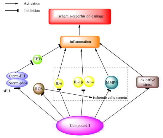 Occluded vessels reperfusion could produce reactive oxygen species (ROS), which would stimulate ischemic cells, secreting excessive pro-inflammatory and inflammatory cytokines, such as IL-6, IL-1β, and TNF-α. The overexpressed cytokines cause damage, hemorrhage, and even inflammation in cerebral vessels, which is a major factor in ischemic brain injury []. Shibata et al. observed little hemorrhagic region with compound 1 (10 mg/kg), in the model of cerebral infarction mice, in comparison with 10 mg/kg t-PA treatment; moreover, they investigated the involved mechanism []. mRNA expression of IL-6, IL-1β, and TNF-α were not increased by the treatment of compound 1, in comparison to t-PA treatment, at 3 h after ischemia. Hashimoto et al. found that compound 1 decreased expression of IL-6, the signal transducer and activator of transcription 3, S100 calcium binding protein A8, and MMP-9 by microarray and RT-PCR analysis []. Therefore, compound 1 inhibited the secretion of pro-inflammatory and inflammatory cytokines to improve the hemorrhage and ischemic brain injury. Meanwhile, Akamatsu et al. detected that superoxide anions (one ROS in cerebral ischemia) were observed by hydroethidine signals at 2 h after reperfusion []. Hydroethidine signal was reduced by the treatment of compound 1 in comparison to the vehicle group, meaning that compound 1 inhibited the production of ROS to decrease reperfusion damage. In addition, the treatment of compound 1 reduced the expression of nitrotyrosine and MMP-9, causing attenuated ischemic neuronal damage. Moreover, inflammatory tissue could release proteolytic enzymes of MMP-9, which is associated with blood–brain barrier breakdown and hemorrhagic complications in cerebral infarction []. Ito et al. indicated that compound 1 inhibited the activation of MMP-9 to protect the blood–brain barrier from destruction and hemorrhagic transformation (pro-MMP-9: 88.9 ± 34.2; MMP-9: 5.0 ± 1.6) in mice []. Besides, Huang et al. suggested that compound 1 could inhibit oxidative stress to reduce ischemia/reperfusion injury []. Compound 1 decreased the expression of 4-hydroxy-2-nonenal (4-NHE), 3-nitrotyrosine, and 8-hydroxy-2′-deoxyguanosine (8-OHdG) significantly, which provided therapeutic benefits for ischemic stroke. Therefore, compound 1 possessed anti-inflammatory and anti-oxidative activities in the reperfusion of occluded vessels (Figure 8).