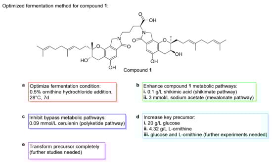 In 2013, Su et al. investigated the fermentation conditions of compound 1 isolated from S. longispora FG216 []. The results showed that the optimized fermentation conditions were as follows: 0.5% ornithine hydrochloride addition, 28 °C culture temperature, and 7 d (Figure 11a). The yield of compound 1 increased up to 1.98 g/L. In 2015, Wang et al. designed a metabolic regulation strategy to improve the production of compound 1 []. The results indicated that the carbon skeleton of compound 1 was synthesized through the shikimate and mevalonate pathways. Therefore, the addition of precursor shikimic acid and precursor sodium acetate increased the yield of compound 1 by 10.4%–14.6% (Figure 11b,c). Glucose and ornithine were the essential skeleton and structural core of compound 1, respectively, which involved the synthesis of compound 1. Along with 20 g/L glucose and 4.32 g/L L-ornithine provision, compound 1 increased up to 82.2 and 95.9 g/L (Figure 11d). During the fermentation, a transformation was observed from ornithine, FGFC3, and FGFC2 into compound 1. Further research is needed for promoting transformation from ornithine to compound 1, which will be able to increase production substantially (Figure 11e).