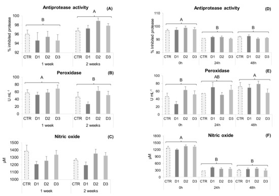 Plasma immune parameters of gilthead seabream juveniles. Experiment one: (A) Antiprotease activity; (B) Peroxidase activity; (C) Nitric oxide. Data are the mean ± SEM (n = 12). Experiment two: (D) Antiprotease activity; (E) Peroxidase activity; (F) Nitric oxide. Data are the mean ± SEM (n = 9). Different capital letters represent significant differences in time regardless diet (p < 0.05).