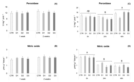 Gut immune parameters of gilthead seabream juveniles. Experiment one: (A) Peroxidase activity; (B) Nitric oxide (NO). Data are the mean ± SEM (n = 12). Experiment two: (C) Peroxidase activity; (D) Nitric oxide (NO). Data are the mean ± SEM (n = 9) Different capital letters represent significant differences in time regardless of diet (p < 0.05).