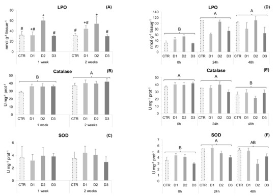 Gut oxidative stress parameters of gilthead seabream juveniles. Experiment one: (A) Lipid peroxidation (LPO); (B) Catalase activity; (C) Superoxide dismutase activity (SOD). Data are the mean ± SEM (n = 12). Experiment two: (D) Lipid peroxidation (LPO); (E) Catalase activity; (F) Superoxide dismutase activity (SOD). Data are the mean ± SEM (n = 9). Different symbols represent significant differences between diets regardless of time (p < 0.05). Different capital letters represent significant differences in time regardless of diet (p < 0.05).