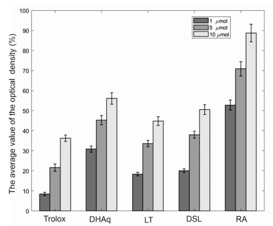 Comparative study of the protective activity of bioflavonoids against linoleic acid peroxidation. The horizontal axis indicates substances and their concentrations (μM), and the vertical axis indicates the inhibition of linoleic acid peroxidation, expressed as % of the control. The average value of the optical density in the control is 0.242 ± 0.016 (100%). The results of three experiments (1–10 µmol) performed in five replicates are presented as m ± SE (Standard Error). Abbreviations: DHAq—dihydroquercetin; LT—luteolin; DSL—luteolin 7,3′-disulfate; RA—rosmarinic acid.