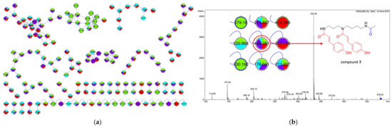 The method was described in our previous work [17]. In brief, a 25 μL aliquot (5 mg/mL, dissolved in MeOH) of the samples was analyzed by LC-MS/MS on a YMC-Pack ODS-A (250 mm × 4.6 mm, S-5 μm, 1 mL/min) column eluted with a gradient program of CH3CN/H2O (0.1% formic acid modifier): 10% to 100% in 30 min, then isocratic elution to 40 min, at a flow rate of 1 mL/min, during which the mass spectrometer was set to detect m/z 50–1500 in the positive ESI mode and with an automated full dependent MS/MS scan enabled. The chromatogram was converted digitally to a .mzML file using freely available MSConvert software and, subsequently, submitted to the GNPS website. Molecular Networking was generated to interconnect MS/MS data from the four samples.