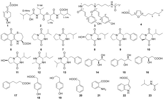 In addition, to discuss the putative biosynthetic pathway of isolated compounds, we initially classified them into five categories based on their structural similarity. The first group was related to the shikimate pathway, including compounds 1, 3 and 14–22; the second group was related to cyclodipeptide synthesis, including compounds 6–13; the third group was related to the acetate-malonate pathway, including compounds 4 and 5; the fourth group was related to acetylation, including compounds 3 and 23; the last group was related to a depsipeptide assembly, which only contained compound 2.