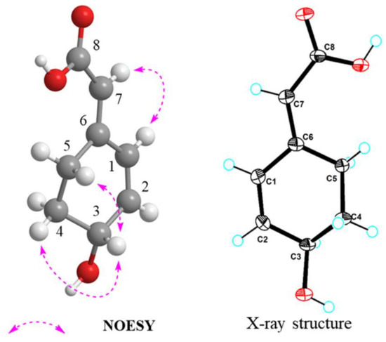 Compound 1 was isolated as a colorless crystal (MeOH-CH3COCH3). It was assigned the molecular formula C8H10O3 by analysis of its HRESIMS (m/z 153.0558 [M − H]−, calcd for C8H9O3153.0557), suggesting four degrees of unsaturation. The 1H NMR spectrum (Table 1) of 1 showed characteristic signals for three olefinic protons at δH 6.16 (H-1, dd, J = 9.9, 1.5 Hz), δH 6.13 (H-2, dd, J = 10.0, 2.5 Hz), δH 5.66 (H-7, br s), and one oxygenated methine at δH 4.31 (H-3, ddd, J = 6.9, 4.9, 2.5 Hz). The 13C and DEPT spectra of compound 1 suggested the presence of eight carbon resonances including two methylenes, four methines (one oxygenated and two olefinic carbons), and two quaternary carbons (one olefinic carbon and one carboxyl). The observation of the 1H-1H COSY correlations of H-1/H-2/H-3/H2-4 (δH 2.03 and δH 1.55)/H2-5 (δH 3.41 and δH 2.54) disclosed a fragment of -CH=CH-CH(OH)-CH2-CH2-. The presences of two structural fragments, one six-membered ring and one α, β, γ and δ-unsaturated acid, were deduced from HMBC correlations (Figure 3) from H-1, H-2, H2-4, H2-5 to C-6 (δC 153.6), from H-1, H2-5 to C-7 (δC 118.0), and from H-7 to C-8 (δC 170.5). The E-geometry of the double bond between C-6 and C-7 was determined by the NOESY correlation of H-1 with H-7 (Figure 4). These above results were unambiguously confirmed by a single-crystal X-ray diffraction analysis using Cu Kα radiation with a sufficient Flack parameter of −0.04 (11) (CCDC 2164734) (Figure 4), resulting in the elucidation of the configuration of C-3 as R. Moreover, compound 1 was named agrocusin A.