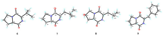 Compound 5 was elucidated as a naphthoquinone linked with homocysteine by comparing its NMR data with those values reported in the literature [24], namely agrocuquinone A. It was firstly discovered and patented as a purple dye combined with its analogs by Japanese researchers in 1977 because of its strong purple color. It was the second time that the molecular structure of 5 was reported, to the best of our knowledge. Compounds 6–13 were identified as cyclodipeptides, in which compounds 6–9 were elucidated by NMR data [25,26] and single-crystal X-ray diffraction analysis using Cu Kα radiation (Figure 5). Compounds 10–13 were determined by comparing their NMR data and specific rotations with those values reported in the literature [27,28,29,30], and verified by Marfey’s analysis (Table S2). Compounds 14–17 were elucidated as phenylbutane derivatives, in which configurations of the hydroxyl groups were confirmed by comparing their NMR data and specific rotations with those values reported in the literature [31,32,33]. Compounds 18–20 were elucidated as simple phenylethane derivatives, and their structures were identified by analyzing their NMR data. Compounds 21–23 were identified as anthranilic acid, indole-3-acetic acid and N-isobutylacetamide by analyzing their NMR data, respectively.