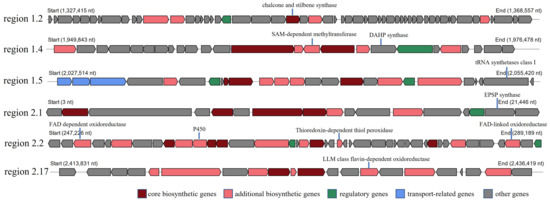 To identify the BGCs related to all isolated metabolites in the genomic sequence of the strain, we uploaded the full sequences of genome to antiSMASH bacterial version 6.0.1 [35] with the default “relaxed strictness” settings. The software predicted five BGCs (regions 1.1–1.5) located on the circular chromosome (Figure S9), corresponding to terpene, T3PKS, oligosaccharide, betalactone and redox-cofactor types. Given that some compounds were considered as primary metabolites by antiSMASH, such as amino acid and fatty acid, we once again retrieved BGCs from the software by changing the settings to “loose strictness”. The output displayed extra fourteen biosynthetic regions (Table S3) that contained two related fatty acid synthesis BGCs (regions 2.2 and 2.17, Figure 6). Moreover, one BGC (region 2.1, Figure 6) that contained the core genes of glyoxylate cycle [36] and a 5-enol pyruvylshikimate-3-phosphate biosynthesis gene related to shikimate pathway [37] was observed. The biosynthesis of compound 4 was putatively related to fatty acid BGCs, but we failed to discover an enzyme similar to RSP_1091 (UfaO) [38], a reported enzyme that can catalyze the conversion of 19M-UFA to 19Fu-FA resulting in a furan ring. Interestingly, a P450 gene and some oxidoreductase genes were discovered in region 2.2 (Figure 6). In combination with the literature reporting that furan ring could be produced by cytochrome P450 enzyme [39,40], we proposed that the biosynthesis of compound 4 was related to region 2.2.