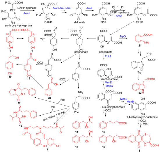 - Herrmann, K.M.; Weaver, L.M. The shikimate pathway. Annu. Rev. Plant Physiol. Plant Mol. Biol. 1999, 50, 473–503. [Google Scholar] [CrossRef]
