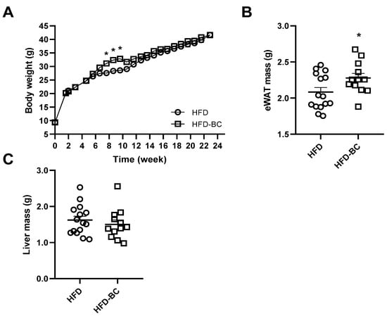 Three-week-old male mice were fed an HFD (n = 15) or an HFD-BC (n = 13) for 23 weeks. (A) Body weight throughout the experiment. (B) eWAT mass. (C) Liver mass. Values are means ± SEM. * Different from HFD group, p < 0.05. BW, body weight; eWAT, epididymal white adipose tissue; HFD, high-fat diet; HFD-BC, high-fat diet supplemented with Dunaliella bardawil.
