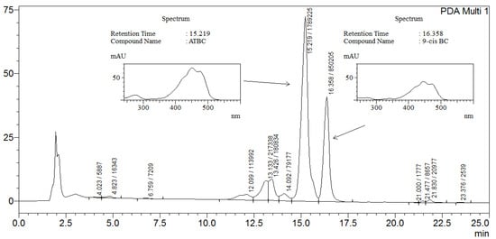 Representative HPLC analysis of hepatic carotenoids (spectrum range 200–700 AU) in a liver of a mouse in the HFD-BC group.