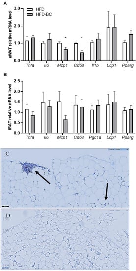We examined the mRNA expression levels of inflammatory markers in eWAT and iBAT. The eWAT mRNA levels of Mcp-1 and Cd68, which are markers for monocyte recruitment and tissue macrophages, were lower by 1.6- and 2.1-fold, respectively, in the HFD-BC group compared with the HFD group (Figure 3A). The mRNA levels of Tnfα and Il-6 in eWAT and iBAT, as well as Il-1β in eWAT, were not different between the diet groups (Figure 3A,B).