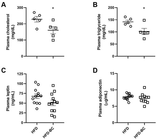 The plasma cholesterol and triglyceride levels in the HFD-BC group were decreased by 28% and 30%, respectively, compared with the HFD group after 23 weeks of treatment (Figure 4A,B). On the other hand, no differences were observed in the plasma leptin and adiponectin concentrations between the HFD-BC and HFD groups (Figure 4C,D).