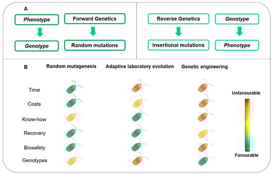 Strain improvement approaches by forward and reverse genetics strategies (A). Comparison of several aspects of three methods of strain improvement: random mutagenesis, adaptive laboratory evolution and genetic engineering (B). Time—time required to perform the experiments and obtain results; Costs—general costs of using these methods; Know-how—level of knowledge required to implement the technology; Recovery—ease of selection and isolation of strains with the desired features; Biosafety—potential biosafety concerns for consumers and environment over the strains obtained; Genotypes—ability to attain the desired genotypes and phenotypes.
