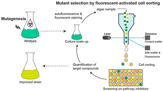 Another approach to mutant screening is the selection of desired traits by high-throughput methods such as FACS (Figure 3). A key characteristic of microalgae is the autofluorescence of several pigments, such as the wine-red fluorescence of chlorophyll a or the carotenoid fluorescence in the green range of the electromagnetic spectrum [125,126]. Furthermore, lipids can be stained by fluorescent dyes such as Nile red or BODIPY505/515. Upon random mutagenesis, lipid- or carotenoid-rich mutants have been isolated by the high-throughput selection of target cells via FACS [6]. Nevertheless, the difficulty in this method is the need for fluorescence, which is only displayed by pigments, solvatochromic dyes, and other signal-specific fluorochromes. Therefore, the correlation of fluorescence to certain compounds needs to be established. For example, in a study on Phaeodactylum tricornutum, the correlation between fucoxanthin and chlorophyll autofluorescence was used to isolate high-fucoxanthin-producing mutants (Table 1) [88].
