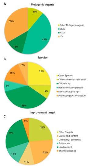 Interestingly, out of the 75 articles published in the literature using random mutagenesis to improve microalgae, EMS was the most widely used mutagenic agent, being the chosen method in 43% of the reports. UV treatment came in second place with 33% of the studies adopting this method (Figure 4A). The most frequently targeted genera were Chlorella and Nannochloropsis with, respectively, 36 and 15% of studies applying these techniques to these microalgae, most probably a consequence of them being of high commercial interest (Figure 4B). Concerning metabolism as the target for improvement, most research was carried out to enhance lipid and carotenoid productivity, 25 and 22% of the studies, respectively (Figure 4C).
