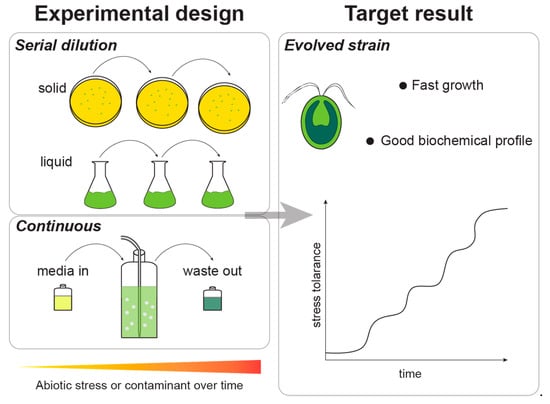 Diagram of adaptive laboratory experiments and expected results. Left—adaptive laboratory evolution experimental designs in batch and continuous mode. The abiotic stress is kept constant or increased, and this leads to the improvement of the culture. Right—after adaptive laboratory evolution, the evolved microalgal strain will be able to tolerate the abiotic stress while maintaining favorable growth parameters and a balanced biochemical profile.