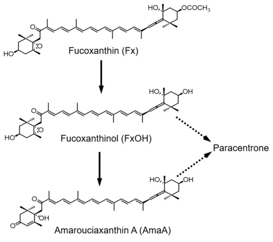 - Takatani, N.; Taya, D.; Katsuki, A.; Beppu, F.; Yamano, Y.; Wada, A.; Miyashita, K.; Hosokawa, M. Identification of paracentrone in fucoxanthin-fed mice and anti-inflammatory effect against lipopolysaccharide-stimulated macrophages and adipocytes. Mol. Food Nutr. Res. 2021, 65, 2000405. [Google Scholar] [CrossRef] [PubMed]