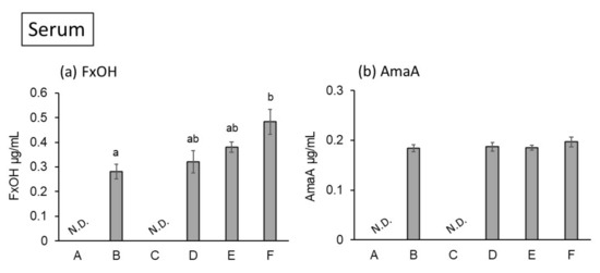 Carotenoid concentration in the serum of KK-Ay mice fed experimental diets for 4 weeks. (A) Control, (B) SO 0.2%, (C) monocaprin 0.5%, (D) SO 0.2% + monocaprin 0.125%, (E) SO 0.2% + monocaprin 0.25%, (F) SO 0.2%+monocaprin 0.5%. (a) FxOH concentration, (b) AmaA concentration. SO: seaweed oil; FxOH: fucoxanthinol; AmaA: amarouciaxanthin A; N.D.: not detected. Bars with different letters are significantly different; p < 0.05.