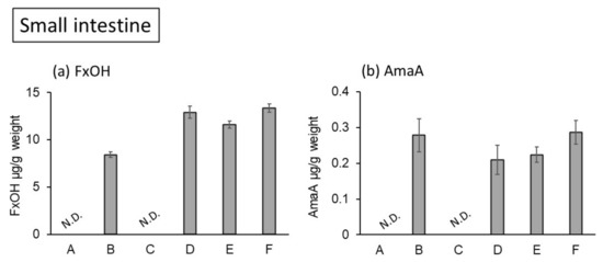 Carotenoid content in the small intestine of KK-Ay mice fed experimental diets for 4 weeks. (A) Control, (B) SO 0.2%, (C) monocaprin 0.5%, (D) SO 0.2% + monocaprin 0.125%, (E) SO 0.2% + monocaprin 0.25%, (F) SO 0.2% + monocaprin 0.5%. (a) FxOH content, (b) AmaA content. SO: seaweed oil; FxOH: fucoxanthinol; AmaA: amarouciaxanthin A; N.D.: not detected.