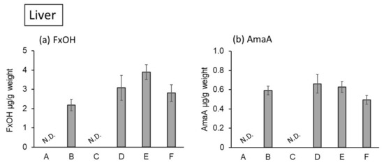 Carotenoid content in the liver of KK-Ay mice fed experimental diets for 4 weeks. (A) Control, (B) SO 0.2%, (C) monocaprin 0.5%, (D) SO 0.2%+monocaprin 0.125%, (E) SO 0.2%+monocaprin 0.25%, (F) SO 0.2%+monocaprin 0.5%. (a) FxOH content, (b) AmaA content. SO: seaweed oil; FxOH: fucoxanthinol; AmaA: amarouciaxanthin A; N.D.: Not detected.