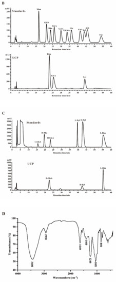 HPGPC chromatogram, HPLC chromatogram, and IR spectrum of UCP. (A) HPGPC chromatogram of UCP on a Shodex OHpak SB-804 HQ column, and the standard curve of molecular weight; (B) HPLC chromatogram for monosaccharide composition analysis of UCP (Man: d-mannose, GlcN: d-glucosamine, Rha: l-rhamnose, GlcA: d-glucuronic acid, GalA: d-galacturonic acid, Glc: d-glucose, Gal: d-galactose, Xyl: d-xylose, Ara: l-arabinose, Fuc: l-fucose); (C) HPLC chromatogram of the sugar configuration determination of UCP (d-Rha: D-rhamnose, d-GlcA: d-glucuronic acid, d-Xyl: d-xylose, l-Rha: l-rhamnose, l-GlcA: l-glucuronic acid, l-Xyl: l-xylose); (D) IR spectrum of UCP.