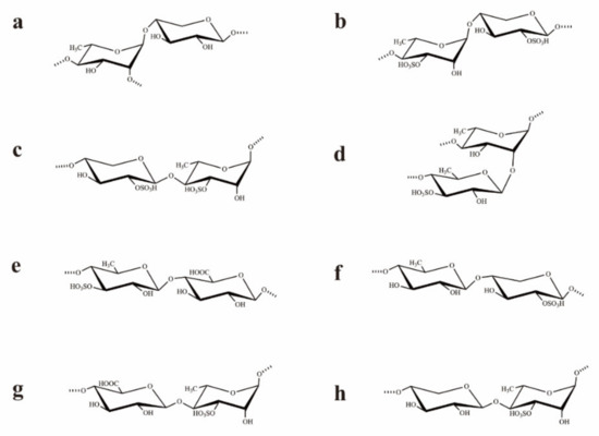 Structures of the possible main repeating disaccharides in UCP. (a): →2,4)-α-l-Rhap-(1→4)-β-d-Xylp-(1→, (b): →4)-α-l-Rhap(3SO4)-(1→4)-β-d-Xylp-(2SO4)-(1→, (c): →4)-β-d-Xylp-(2SO4)-(1→4)-α-l-Rhap(3SO4)-(1→, (d): →4)-β-l-Rhap(3SO4)-(1→2,4)-α-l-Rhap-(1→, (e): →4)-β-l-Rhap(3SO4)-(1→4)-β-d-GlcAp-(1→, (f): →4)-β-l-Rhap-(1→4)-β-d-Xylp-(2SO4)-(1→, (g): →4)-β-d-GlcAp-(1→4)-α-l-Rhap(3SO4)-(1→, (h): →4)-β-d-Xylp-(1→4)-α-l-Rhap(3SO4)-(1→. These are the possible main repeating disaccharides, and some of them may not be present.