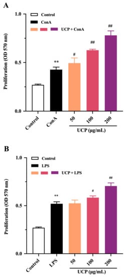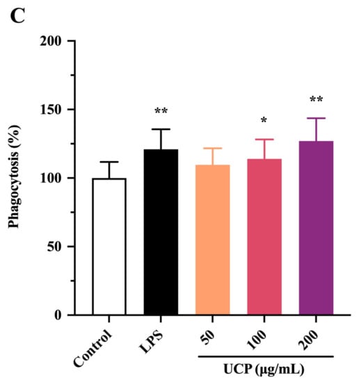 The immunomodulatory activity of UCP was firstly evaluated by the proliferation ability of lymphocytes from mouse spleen. As shown in Figure 3A,B, the lymphocyte proliferation of UCP occurred in a concentration-dependent manner in the presence of Con A or lipopolysaccharide (LPS). At 200 μg/mL, UCP significantly increased the lymphocyte proliferation. Moreover, the lymphocyte proliferation of UCP was more noticeable when UCP was co-treated with ConA than with LPS at the same concentration. Lymphocyte proliferation is a pivotal event in the activation cascade of both cellular and humoral immune responses. Lymphocyte proliferation is dependent on mitogen. T cells are responsive to Con A, while LPS mainly stimulates B cell proliferation [31]. ConA can trigger the proliferation of T lymphocytes and is an important indicator of cellular immunity. LPS causes polyclonal activation of B lymphocytes, which indicates the ability of humoral immunity [32,33]. The present results showed that UCP could significantly stimulate the proliferation of T and B lymphocytes induced by ConA or LPS, illustrating that UCP could induce humoral immunity and cellular immunity to enhance the body’s immune function.