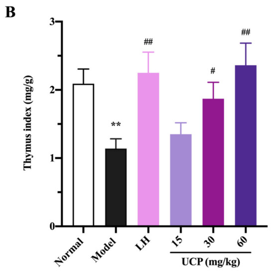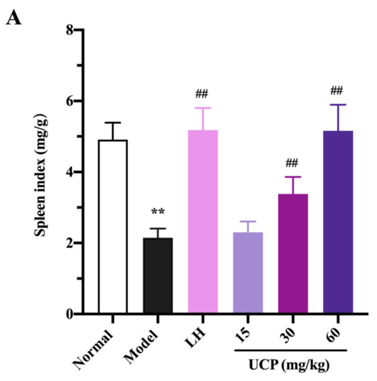 Influences of UCP on the spleen index (A) and thymus index (B) in the immunosuppressive mice induced by cyclophosphamide. The data were represented as the means ± SD (n = 10). Significant: ** p < 0.01 vs. normal group; # p < 0.05, ## p < 0.01 vs. model group.