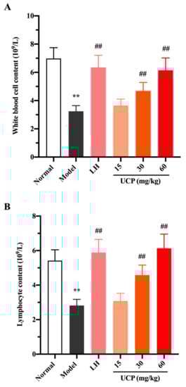 White blood cells, lymphocytes, and platelets in peripheral blood can recognize the foreign antigens and mount an immune response, which are key hematological parameters of the immune system and reflect the body’s immune function [41]. Cyclophosphamide can cause the acute suppression of hematopoiesis, together with leucopenia, thrombocytopenia, and anemia [42,43]. The influences of UCP on white blood cells, lymphocytes, and platelets in peripheral blood of immunosuppressive mice were investigated. As shown in Figure 5, compared with the normal group, the numbers of white blood cells, lymphocytes, and platelets were significantly decreased in the model group, indicating that the hematopoietic inhibition model was effectively established.