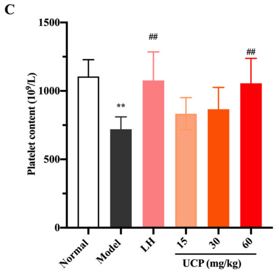 Effects of UCP on the white blood cell content (A), lymphocyte content (B), and platelet content (C) in immunosuppressive mice induced by cyclophosphamide. The data were represented as the means ± SD (n = 10). Significant: ** p < 0.01 vs. normal group; ## p < 0.05 vs. model group.