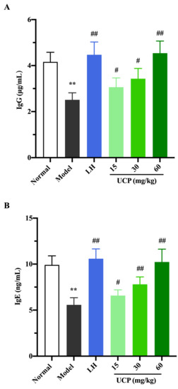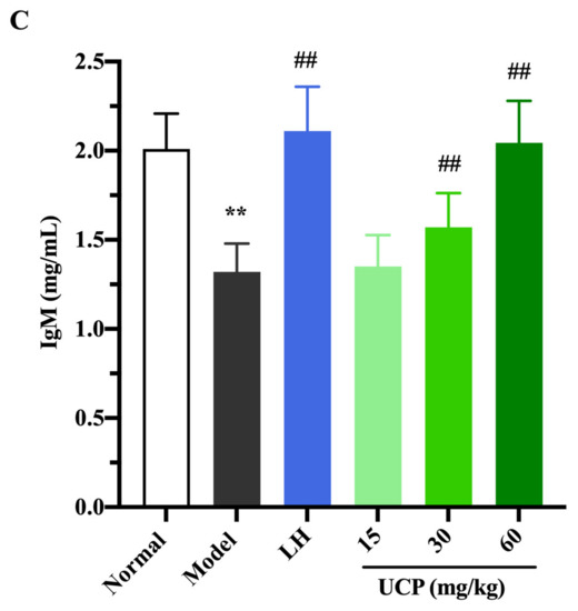 Immunoglobulin (Ig) is a polyclonal antibody and has a direct correlation with the complement activation and neutralization of bacteria or viruses and toxins in the humoral immune response [44,45]. In order to study the effect of UCP on serum antibody levels in immunosuppressive mice, the levels of IgG, IgM, and IgE in serum were determined. As shown in Figure 6, the levels of IgE, IgG, and IgM in serum were significantly decreased when the mice were treated with cyclophosphamide compared with the normal group. UCP noticeably increased the levels of IgG, IgE, and IgM in the serum of the immunosuppressive mice in a dose-dependent manner. At the dose of 60 mg/kg, the levels of IgG, IgE, and IgM in UCP groups were significantly enhanced compared with model groups. Moreover, it was noted that the results were similar to those of LH groups. The data demonstrated that UCP could effectively improve humoral immunity.
