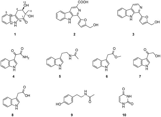 The other eleven compounds were determined to be flazine (2) [14], perlolyrine (3) [15], (1H-indol-3-yl) oxoacetamide (4) [16], N-acetyl tryptamine (5) [17], indole-3-methylethanoate (6) [18], 3-(hydroxyacetyl)-indole (7) [19], indole-3-acetic acid (8) [20], N-acetyl-tyramine (9) [21], and uracil (10) [22] by comparing their NMR data (Supplementary Figures S9–S26) with those reported in the literature.