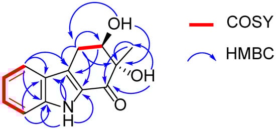 Exophilone (1) was isolated as a pale yellow solid, and its molecular formula was established to be C13H13NO3 by HRESIMS (m/z 232.0967 [M + H]+, calcd. 232.0968) (Supplementary Figure S1), suggesting eight degrees of unsaturation. Analyses of its 1H, 13C, and HMQC NMR spectra (Table 1 and Supplementary Figures S2–S5) revealed the presence of one carbonyl (C-1), two aromatic quaternary (C-4a, C-5a), two tertiary amines (C-8a, C-1a), and four aromatic methines (C-5 to C-8), as well as one tertiary alcohol (C-2), one secondary alcohol (C-3), one methylene (C-4), and one methyl (C-10). The carbonyl and four double bonds accounted for five out of the eight degrees of unsaturation required by the molecular formula, and the remaining three suggested a structure with three rings in 1. Based on the COSY correlations between H-5 (δH 7.66, d, J = 7.8 Hz) and H-6 (δH 7.08, ddd, J = 7.8, 7.2, 1.2 Hz), between H-6 and H-7 (δH 7.30, ddd, J = 7.8, 7.2, 1.2 Hz), between H-7 and H-8 (δH 7.38, d, J = 7.8 Hz), as well as HMBC correlations between H-5 and C-5a (δC 125.3), C-8a (δC 138.9), and C-4a (δC 123.6), between H-8 and C-5a (δC 125.3) and C-8a (δC 138.9), between H-9 (δH 11.59, s) and C-4a (δC 123.6), C-5a (δC 125.3), C-8a (δC 138.9), and C-1a (δC 129.5), the presence of 2,3-substituted indole moiety was confirmed (Figure 2 and Supplementary Figure S6–S7). The third ring was confirmed by C-1 (δC 192.4) to C-4 (δC 27.5), where C-1 attaches to C-1a and C-4 attaches to C-4a. This was supported by the HMBC correlation between C-4 methylene protons and C-4a, C-1a, C-2, and C-3, between the methylene protons and the carbonyl C-1, between the methyl protons CH3-10 (δH 1.24, s) and C-2, C-1, and between H-3 (δH 4.03, m) and C-4a suggested that C-1 is connected to C-2 and C-2 is connected to C-3 and C-10. Further, the HMBC spectrum allowed the assignment of the position of the OH groups (δH 5.25 and 5.16 ppm) to C-11 and C-12 from their correlations with C-1 and C-10 as well as C-2 and C-4, respectively (Figure 2 and Supplementary Figure S7). Hence, the structure of 1 was elucidated as shown (Figure 1).