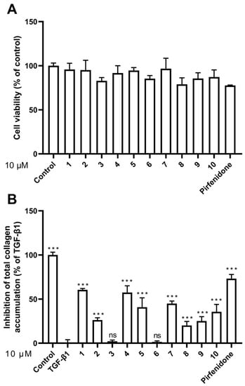 Effects of compounds 1–10 on cell viability and collagen accumulation. (A) Cell viability was calculated by CCK8 assay at a concentration of 10 μM; (B) Inhibitory activity against TGF-β1-induced total collagen accumulation in HFL1 cells at a concentration of 10 μM. The results are the means ± SD of at least three independent experiments. *** p < 0.001 compared with the TGF-β1 group. ns: no statistical difference.