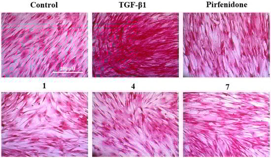 Picro-Sirius Red (PSR) staining for the total collagen accumulation induced by TGF-β1 in HFL1 cells. The representative images are the cells induced by TGF-β1 and treated with 10 μM of compounds 1, 4, 7, pirfenidone, and the control group (untreated normal cells). Scale bar: 200 μM.
