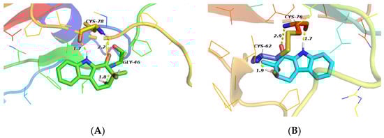 Molecular docking studies of compound 1. (A) Docking mode of compound 1 to 1KLS; (B) Docking mode of compound 1 to 3KFD (Yellow dotted lines represent hydrogen bonds, and numbers represent bond distances).