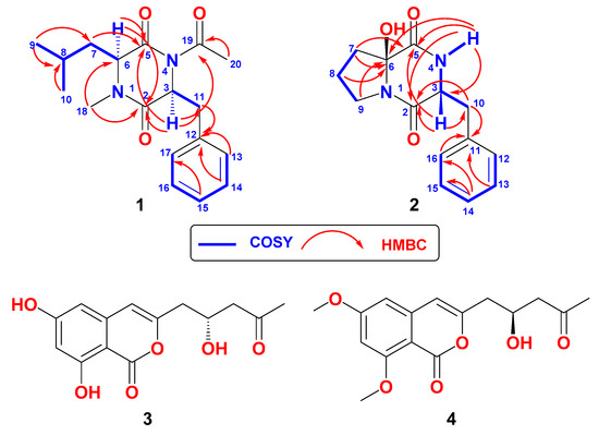 Structures of 1–4, and COSY and HMBC correlations of 1 and 2.