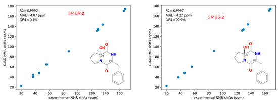 As shown in Figure 4, the 3R,6S configurations for 2 were supported by all of the metrics used. The correlation between the experimental and theoretical chemical shifts was higher for 3R,6S (R2 = 0.9997) and the mean average error (MAE) value was lower for 3R,6S isomer and, finally, a 99.9% DP4 score for this isomer (Figure 4). All of the calculations for both isomers (3R,6R and 3R,6S) of 2 can be found in Table S1 of the Supplementary Materials. Accordingly, 2 was assigned as cyclo(d-6-OH-Pro-d-Phe) and named asperopiperazine B.