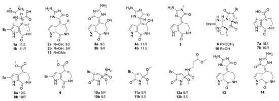 - Al-Mourabit, A.; Zancanella, M.A.; Tilvi, S.; Romo, D. Biosynthesis, asymmetric synthesis, and pharmacology, including cellular targets of the pyrrole-2-aminoimidazole marine alkaloids. Nat. Prod. Rep. 2011, 28, 1229–1260. [Google Scholar] [CrossRef] [PubMed]