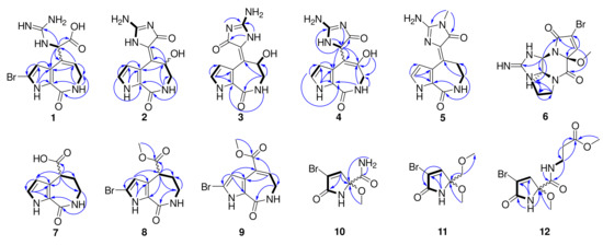 Five characteristic skeletons of the alkaloids (1–12) above-mentioned were isolated from the sponge Stylissa massa. Compound 1 was the first identified precursor metabolite of the classic 5/7/5 tricyclic skeleton with unesterified guanidine and carboxyl groups. Through the NMR data analysis of compounds 2, 3, 13, 14, and 15, an experience rule to determine the Z/E configurations of double bond ∆10,11 was summarized based on the signal intensity in the 13C NMR spectra (Figure 4).