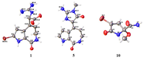 Compound 5 was obtained as colorless bulk crystals. Its molecular formula was determined to be C12H13N5O2 by HRESIMS (m/z 260.1148, calcd. [M + H]+ for m/z 260.1142), which required nine degrees of unsaturation. The 1D and 2D NMR data revealed its similarity with the known compound 13, with the only difference at 13-NMe with the extra signals of δH 3.11 and δC 25.8 in the 1H and 13C NMR spectra (Tables S1 and S2). The HMBC correlations from 13-NMe to C-12 and C-14 further confirmed the planar structure of 5 (Figure 2). Fortunately, a suitable bulk crystal was obtained followed by X-ray diffraction (Figure 3), and the result showed that the previously proposed rule of distinguishing Z/E configurations of double bond ∆10,11 in 5/7/5 spongiacidin-type PIAs was trustworthy.