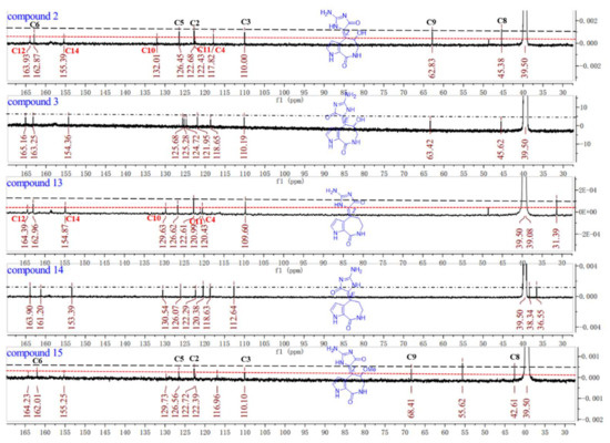 The comparison of the 13C NMR spectra of compounds 2, 3, 13, 14, and 15 (125 MHz, DMSO-d6).