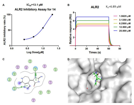 The ALR2 inhibitory activity for compound 14. (A) Concentration dependent curve of the ALR2 inhibitory assay for 14. (B) The result of the surface plasmon resonance (SPR) binding assay of 14 and ALR2 with a KD value of 6.89 µM. (C) Ligand interactions between ALR2 and 14. (D) The 3D binding model of compound 14 with ALR2, the surface of the protein is shown in grey, and the interaction bond is shown in the red dotted line.